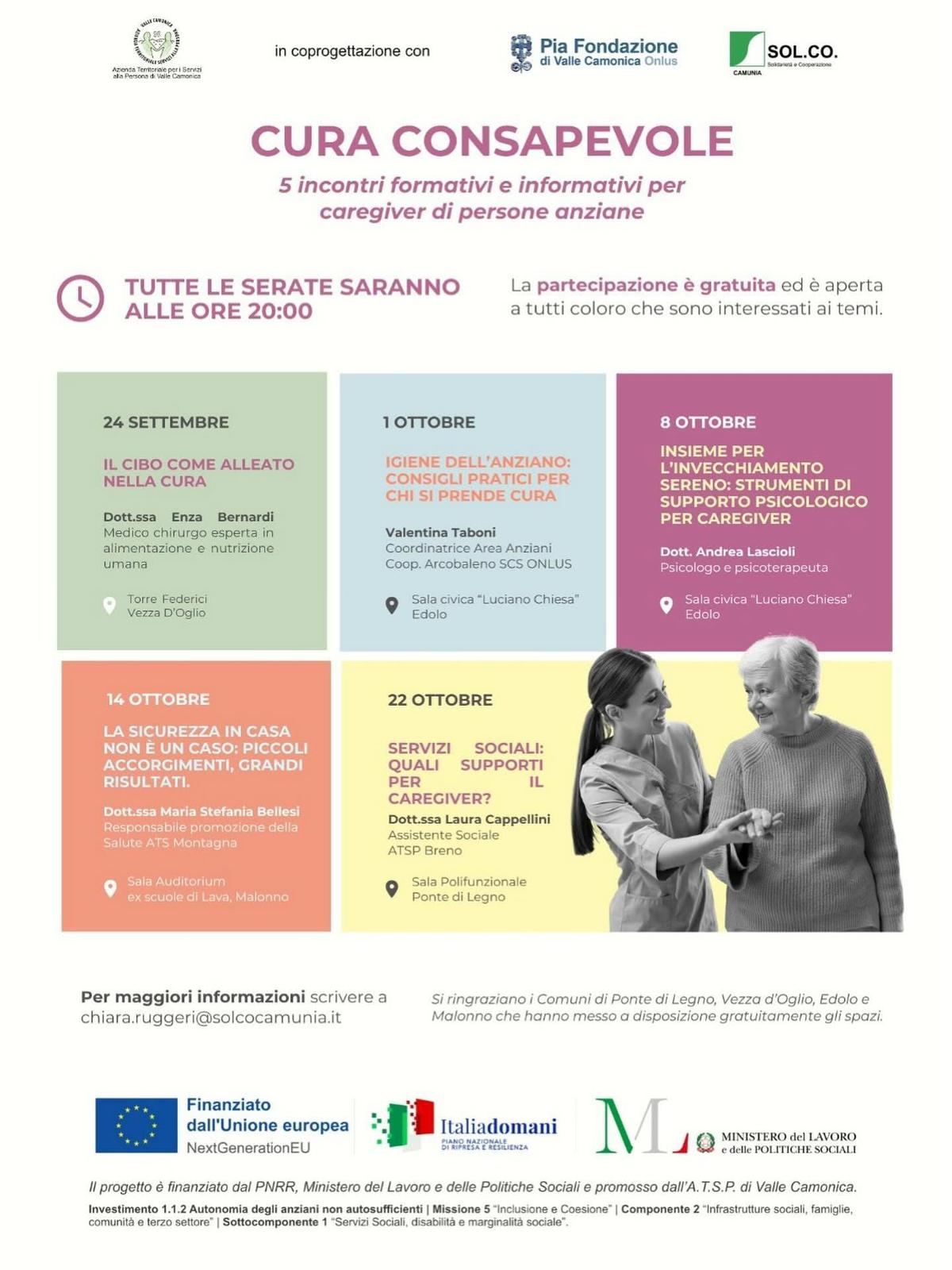 All'interno del progetto "CURA CONSAPEVOLE", promosso da ATSP Vallecamonica e finanziato dal PNRR, Ministero del Lavoro e delle Politiche Sociali, sono stati organizzati, sul nostro territorio, i seguenti incontri: